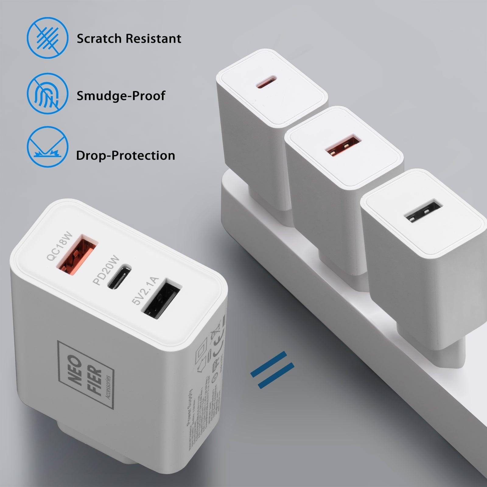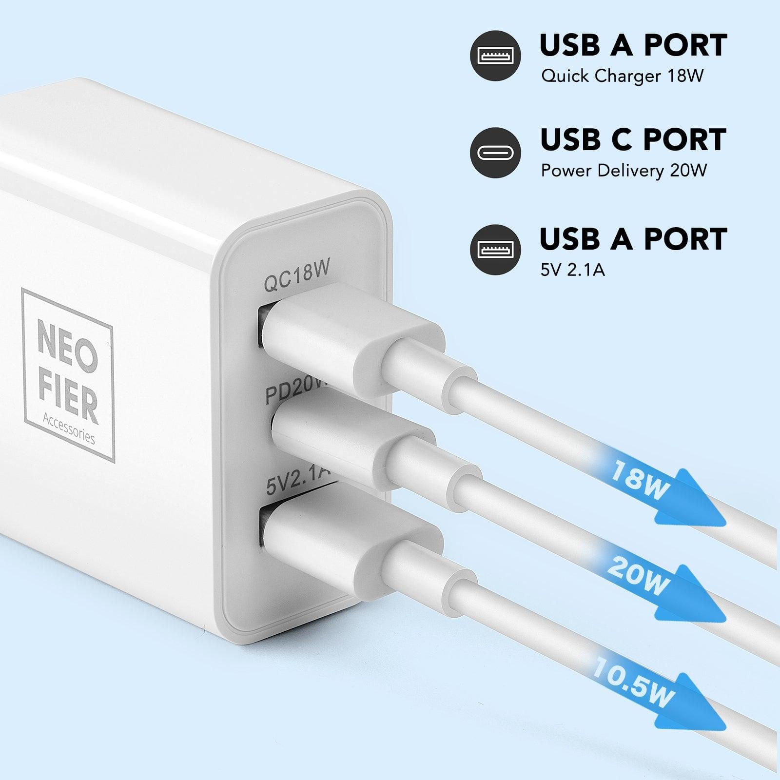 The Neofier wall charging adapter supports 3-ports for USB-A and Type-C cables. QC3.0 18W +PD20W type-C+USB-A 5V2.1A